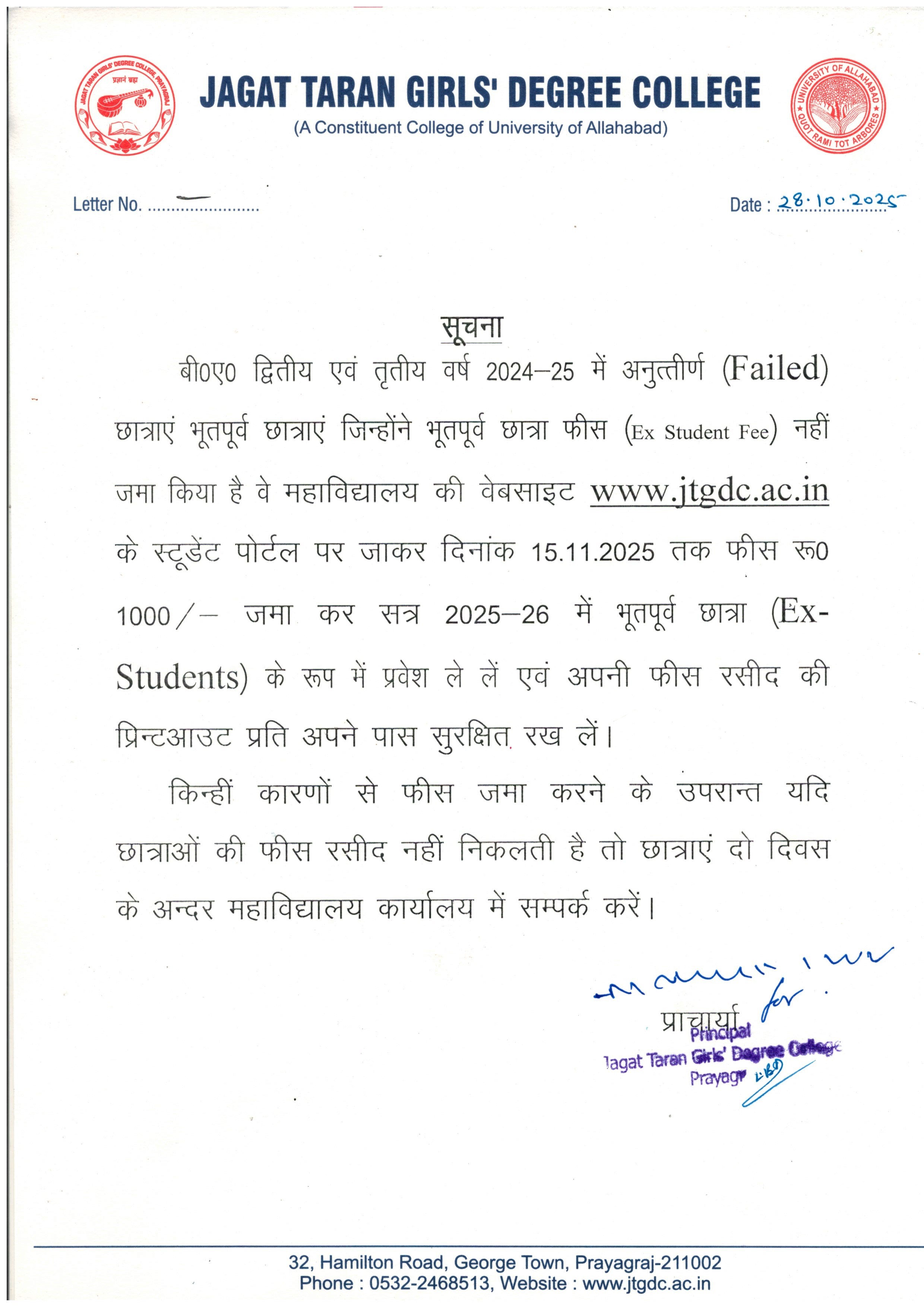 Extended date for Fee Submission of EX_ Student - BA II & BA III 2024-25
