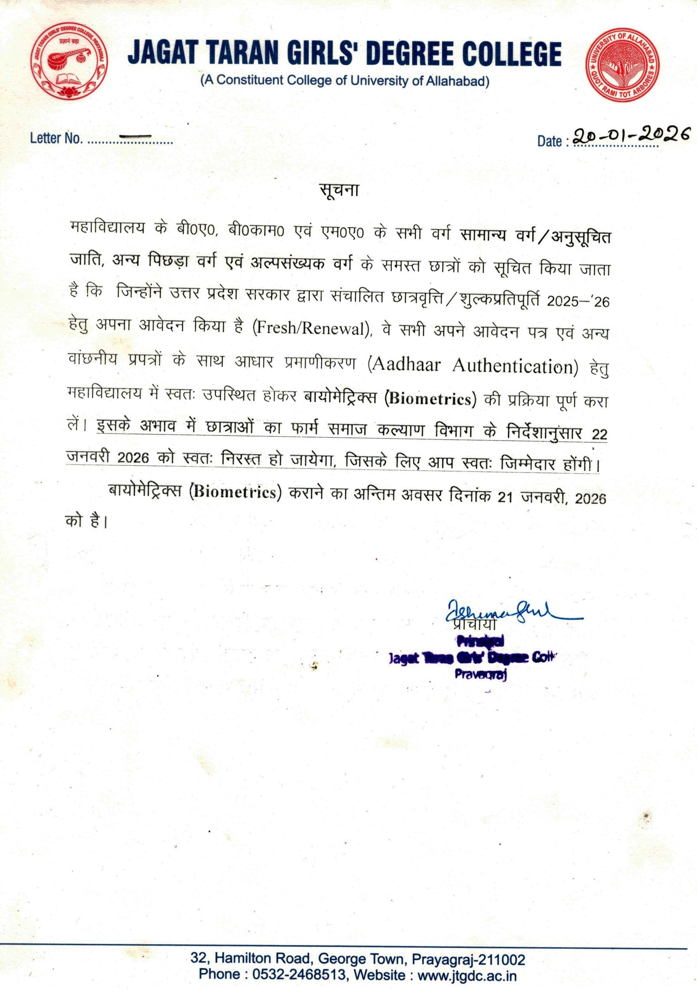 Last Date for Aadhaar Authentication (Bio-metrics) of General, OBC, SC & Minority Student 2025-26