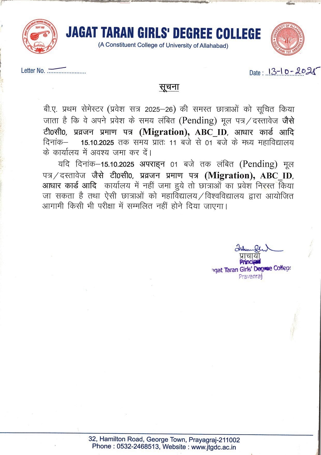 Submission of Pending Document of Newly Admitted Students of B.A. I Sem Session 2025-26