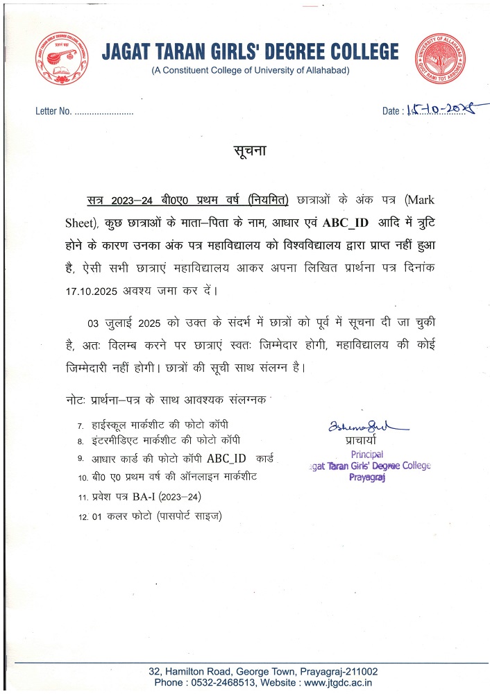 Β.Α. Ι (2023-24) Regular: Pending List of students whose marksheet was not received in College