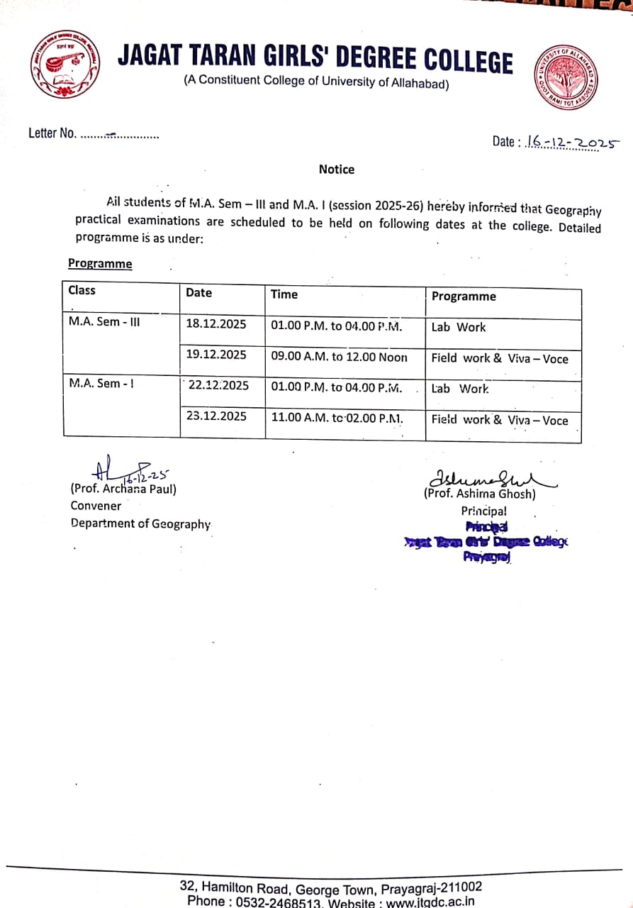 MA I & III SEM, Geography Practical Examination Schedule 2025-26